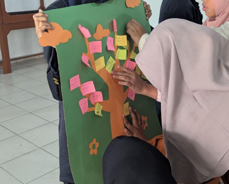 Kegiatan ini dilaksanakan oleh kelompok 5 yang beranggotakan 11 mahasiswa/i yang dimulai dari pukul 09.30 – 11.00 WIB. Kegiatan ini diikuti kurang lebih 50 anak panti mulai dari usia SD sampai SMA/SMK. Pelaksanaan kegiatan dilakukan melalui penyampaian materi edukatif secara interaktif mengenai penggunaan media sosial yang bijak, dilanjutkan dengan sesi tanya jawab dan berbagi motivasi oleh mahasiswa. Di sesi tanya jawab pun, beragam pertanyaan diajukan oleh mereka. Kegiatan semakin meriah dengan adanya games seru yang melibatkan partisipasi aktif anak-anak. Pada sesi akhir, anak-anak diajak membuat pohon cita-cita atau harapan dengan menuliskan impian mereka dan menempelkannya pada pohon cita cita sebagai bentuk komitmen, motivasi dan doa untuk masa depan.